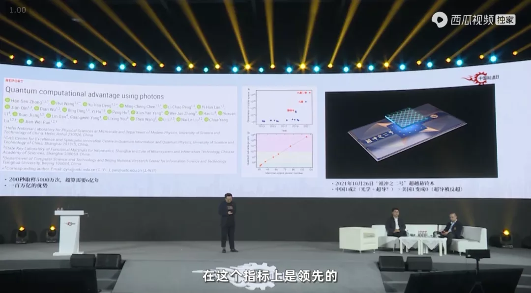 所以有很多人説九章就是個光學實驗,沒錯它是個光學實驗,但是這個光學實驗它可以等價於解一個數學問題,在這個意義上它是一個計算機。而且當你解這個數學問題的時候,它比現在的傳統計算機要快得多,快多少呢?九章200秒取樣了5千萬次,當時那個最強的經典計算機做同樣的任務需要6億年,200秒對6億年,這是100萬億倍也就是10的14次方。當然了經典計算機也可以進步,你追我趕,大家努力想要趕上它。但實際上在這個領域發生的事情是,越來越追不上。過了一年之後這個九章又升級了,它現在是九章二號,它有很多指標都提升了。