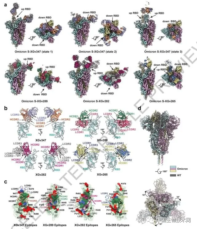 研究團隊還挑選出4株抗體進行進一步的結構生物學分析,其中XGv347(II類抗體)與XGv289(IV類抗體)這兩株抗體對包括奧密克戎在內的所有關切變異株均具有極強的中和活性。