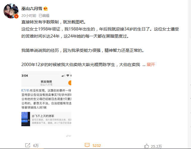 “徐州八孩媽媽”事件曝光後,1月29日,重慶巫山童養媳事件當事人馬豔泮@巫山六月雪 在微博上發文: