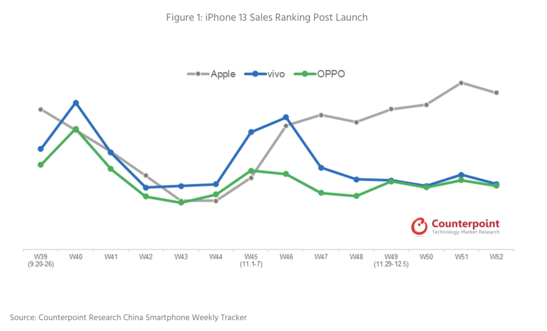Counterpoint Research 公佈 iPhone 13 發佈後在中國市場的銷售排名