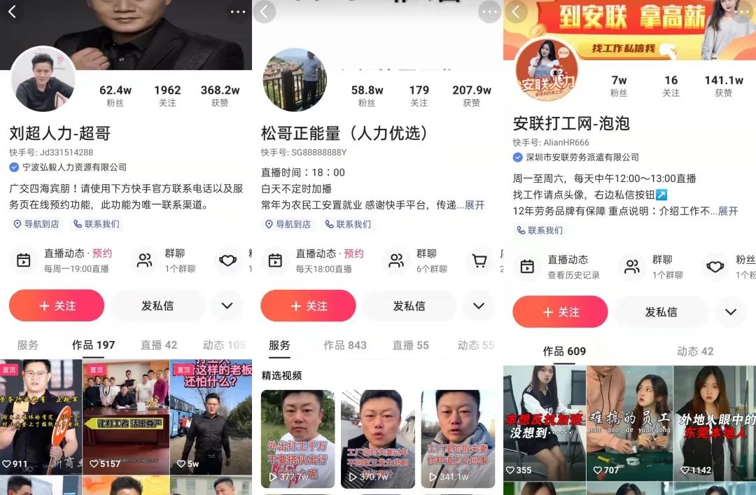 與此同時,越來越多的主播開始涉足藍領招聘,快手則是最主要的平台。除了下沉市場的用户體量更大外,快手的信任文化也更有利於拉近主播與觀眾的距離,提供招聘所必須的天然信任感。