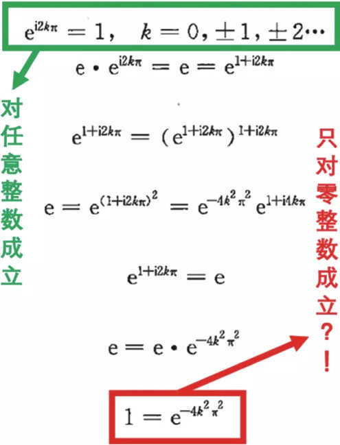 實數運算拓展到複數運算因為產生新的現象,不能完全受實數運算中的規則束縛,有些在實數中的常識,在複數運算處理時可能並不適用要引起注意,這裏舉例講複數乘方運算中的一條反常識之處:複數乘方運算稍不注意就會引起自相矛盾的悖論,如圖4所示,據記載最初由放牛娃出身的克勞森 (ThomasClausen) 於1827年提出[2]。克勞森悖論實際上不是複數的問題,而是在複數乘方運算過程中,復底數的相位求取是多值化的,跟乘方運算的指數相乘的相位應當為相位主值加上2πk (k 為整數)。如圖5所示的兩個乘方運算結果舉