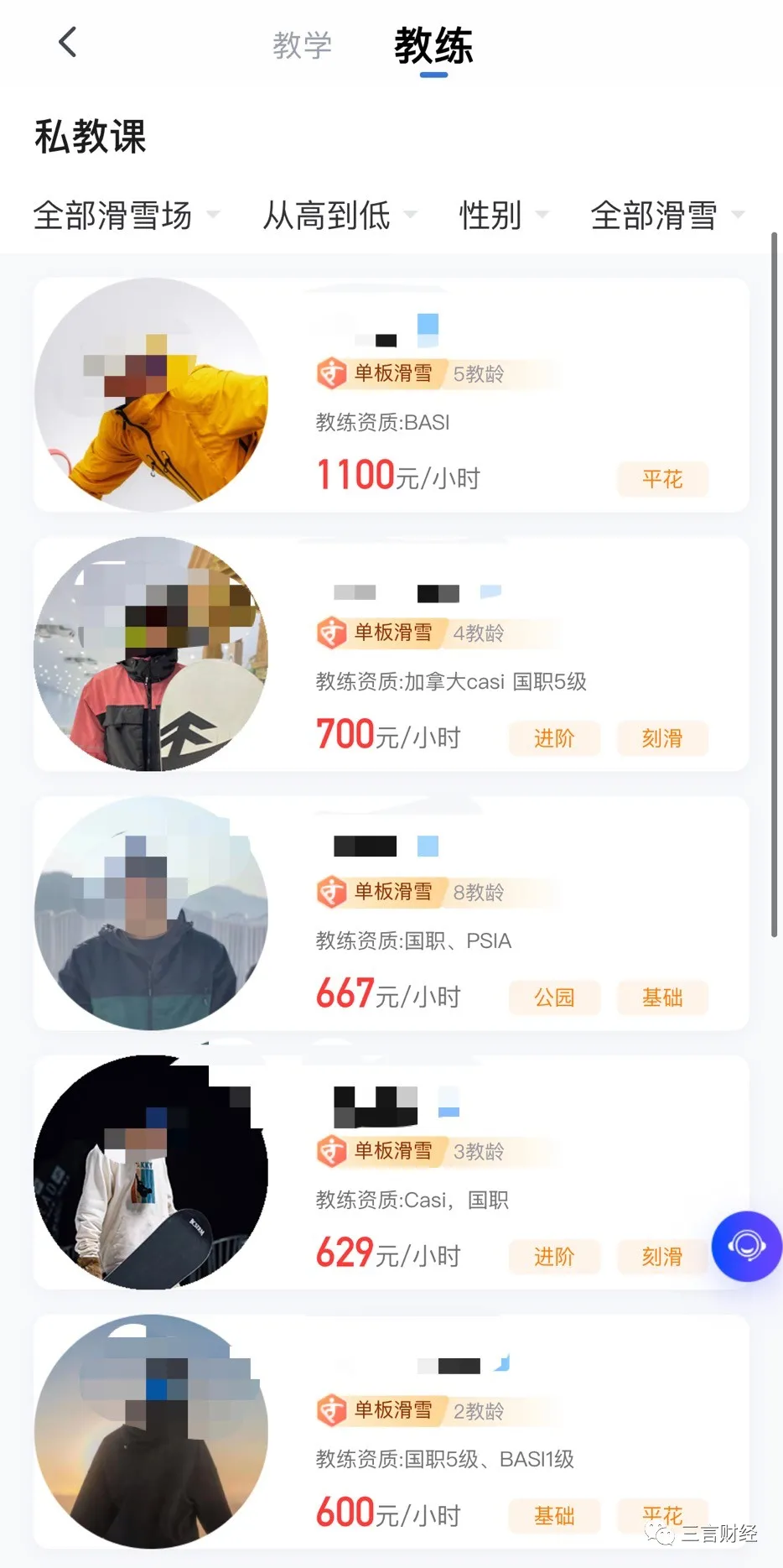 三言財經在某滑雪社區App提供的教練服務中發現,用户可以在該平台選擇大量專業教練作為自己的滑雪指導,但是聘請這樣的一對一教練成本相當高。