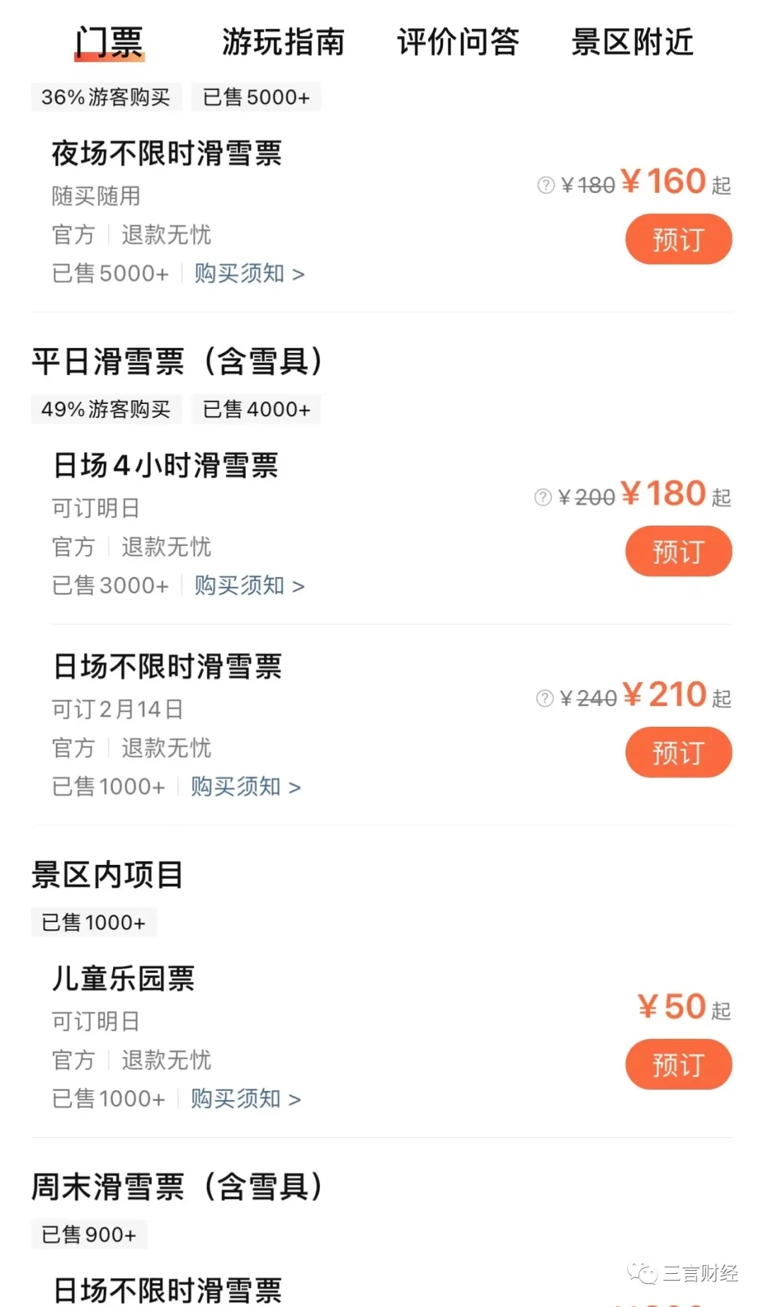 各大滑雪場依據時間場次,票價最低88元,最高為360元;用户若通過社交平台以團購方式購買,則可便宜幾十元。