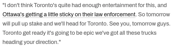 **其中一位遊行組織者Chris Barber週二晚上在社交媒體上揚言,**因為渥太華遊行現場警方已實施更嚴格的管控,示威活動將從渥太華轉戰到多倫多繼續進行。