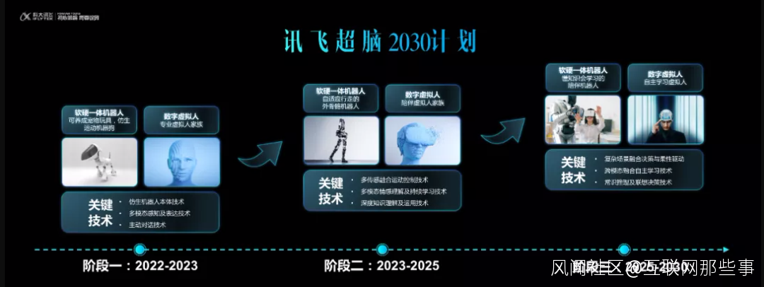 訊飛超腦2030計劃共分為三個階段,而且每個階段都會圍繞“懂知識、善學習和能進化”,分階段地實現軟硬一體機器人和數字虛擬人的智能迭代、壯大。