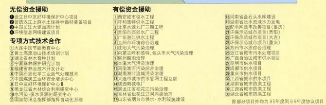 日本為中國城市的下水道治理提供了大約2000億日元貸款,建造的污水處理廠規模占城市污水處理能力的16%。1993年12月運行的北京高碑店污水處理廠,建成時全國第一大污水處理廠,總投資66.9億日元,日處理污水50萬噸,利用日本貸款26.4億日元。同期的北京市區自來水管道建設投資總額210億日元,利用日本貸款154.8億日元,第9自來水廠投資總額320億日元,利用日本貸款146.8億日元。
