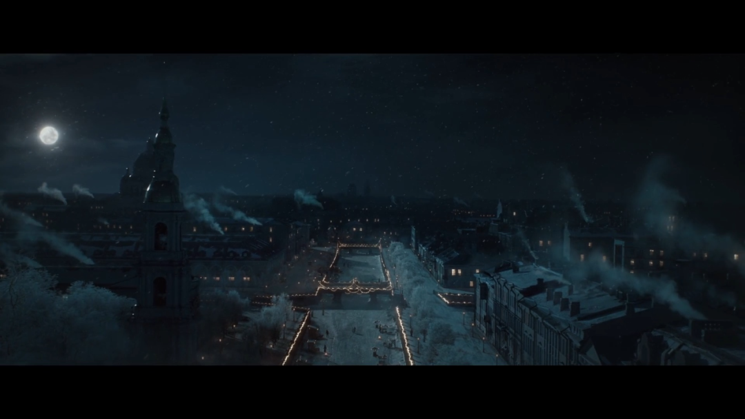 Netflix出品的聖誕節冬日電影,鏡頭從結冰的河道、擁擠的街頭、忙碌的人羣與宏偉的宮殿城堡,拉近到金碧輝煌的貴族舞會。
