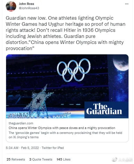 “拒絕新冷戰”運動的發起人之一、倫敦經濟與商業政策署前署長、人大重陽高級研究員羅思義(John Ross,推特粉絲1.6萬,推特賬號:@JohnRoss43)近日連續在其推特反擊英國《衞報》扭曲中國人權。2月5日,他對《衞報》一篇關於北京冬奧會開幕式點火儀式中一名運動員中有維吾爾族血統而證明人權受到侵犯的觀點進行了強烈抨擊。他表示,“《衞報》又創無下限新舉,這純粹是歪曲事實”。