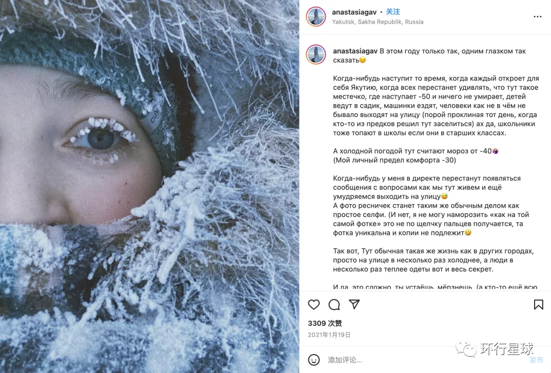 西伯利亞雅庫茨克的女孩阿納斯塔西婭·格魯茲德娃(Anastasia Gruzdeva),在Instagram上發佈了這張自拍照,-47°C的温度中,她的睫毛凍結了
