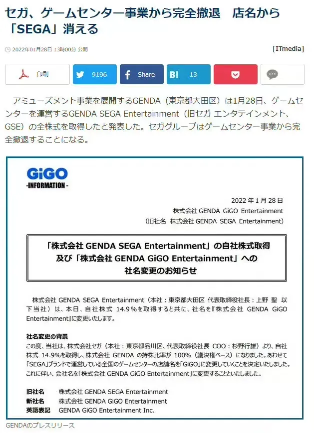 2022年1月28日,SEGA世嘉徹底退出經營56年的街機市場、日本全國街機廳“SEGA”店名將改為“GiGO”。