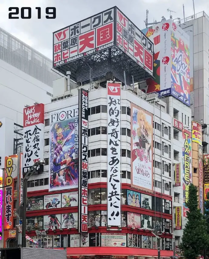 ▼2021年的**秋葉原,變成「空き葉原」**了,外牆乾乾淨淨,全撤了個徹底,相當於地標建築的都搬空了。(官網説的是這棟樓裏的都搬到2號店了,等於和2號店合併。)