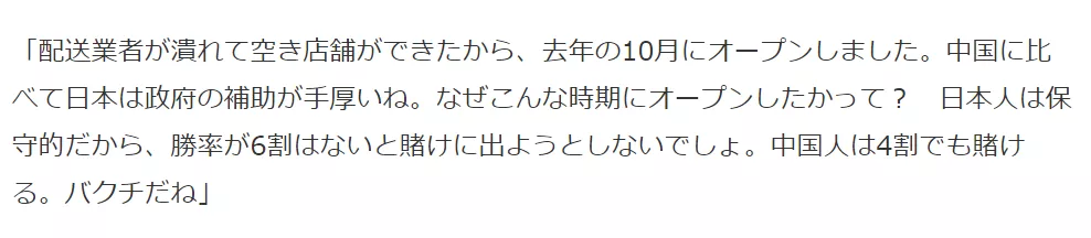 為什麼會在這個時期開業呢?日本人比較保守,沒有6成的勝率是不會去賭一把的,但中國人就算是隻有4成也會賭上一把。”