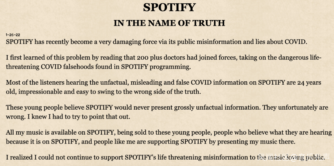 1月24日,Neil Young為了抗議Joe Rogan在其播客節目《Joe Rogan Experience》中傳播的關於COVID-19疫苗的誤導性信息,在個人網站上向Spotify喊話,要求其在下架Joe Rogan的節目和刪除自己的音樂中二選一。
