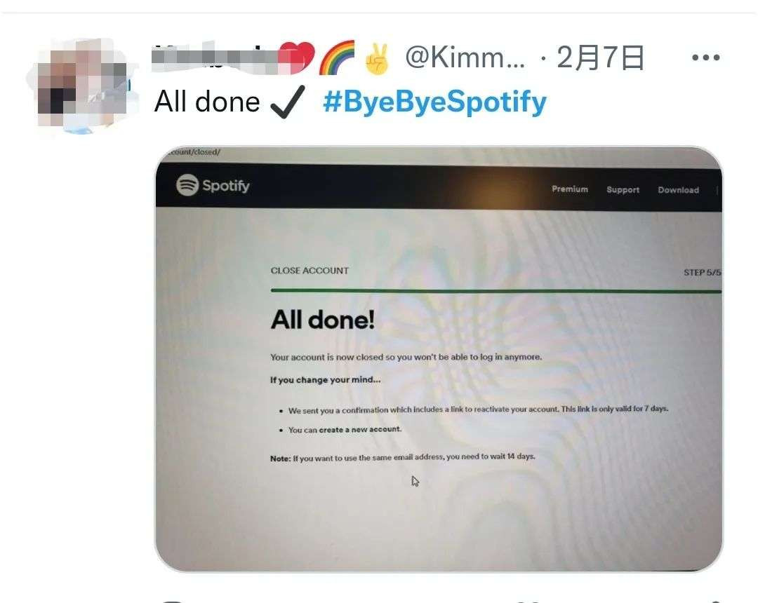 與此同時,社交媒體上有大量網友加入了#ByeByeSpotify#,分享他們取消Spotify賬户的截圖。