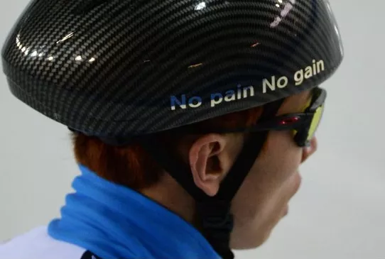 細心的觀眾看到他的頭盔邊緣印了一行英文:No pain NO gain(沒有痛苦就沒有收穫)。