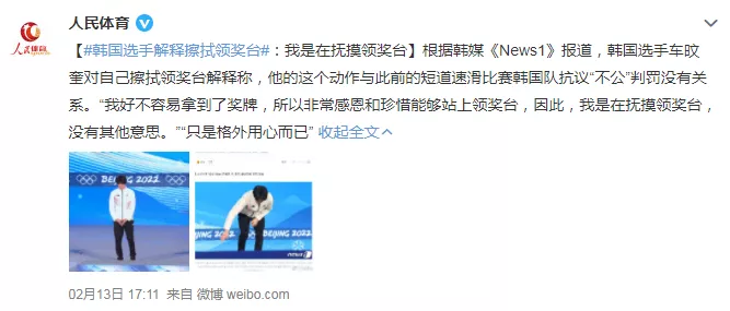 2月12日,韓國選手車旼奎在速度滑冰男子500米比賽上獲得銀牌,結果在登台領獎前,他先彎腰擦了擦領獎台才上去……