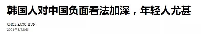 2020年,皮尤研究中心在14個國家做的一項調查,韓國是唯一一個年輕人對中國的負面看法比前幾代人更多的國家。“在我們的調查中,40歲以上的人羣裏不喜歡日本的人仍多於不喜歡中國的人。但將在未來幾十年領導韓國的20多歲、30多歲的這代人中,不喜歡中國的佔上風。”