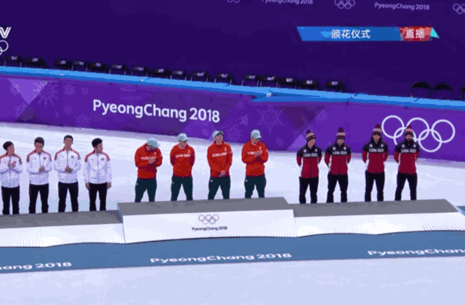 行吧,你愛怎麼説就怎麼説,但是這個動作為什麼看起來這麼眼熟?2018年韓國平昌冬奧會的男子短道速滑 5000 米接力賽的頒獎儀式上,獲得銅牌的加拿大隊員也曾經做了相同的動作,想必他們也是在表達對舉辦方韓國的尊重。