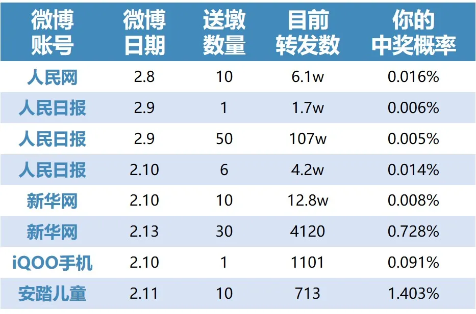 我算了一下,如果上述每條微博你都轉發了的話,那麼你至少能中1墩的概率將高達2.258%!還是值得一搏的!