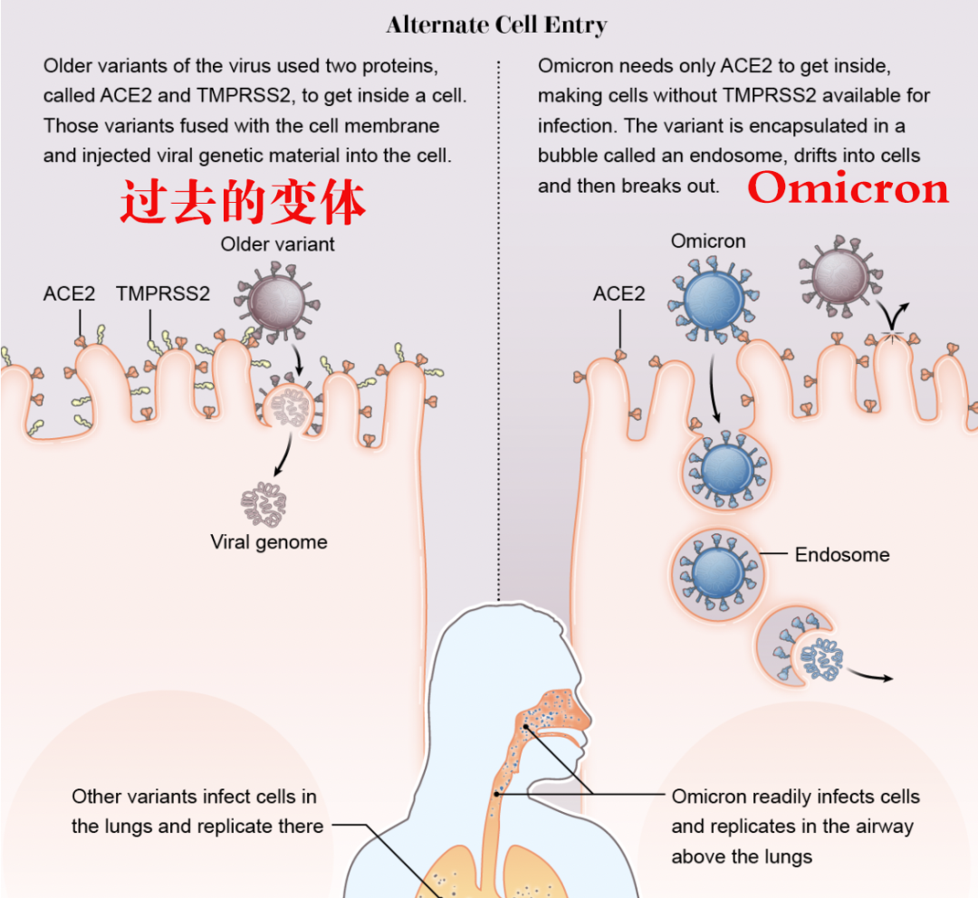 但Omicron沒有使用TMPRSS2,而是採用完全不同的途徑進入細胞。在與ACE2結合後,它包裹在細胞膜的囊泡結構中,囊泡漂移進胞內,病毒隨後暴發並開始接管細胞。