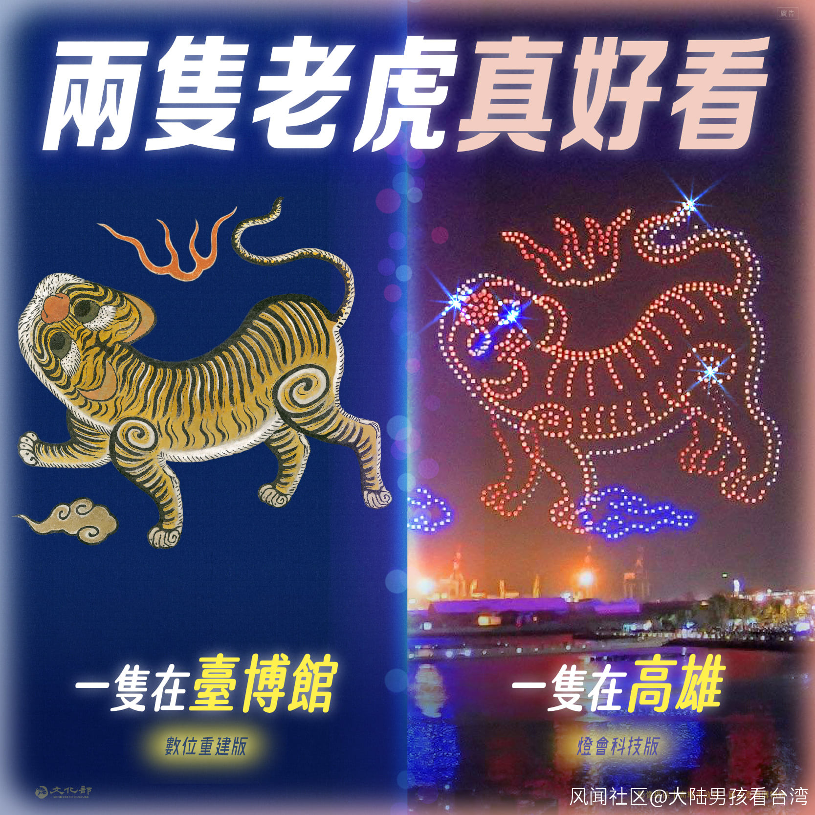 近日高雄的“台灣燈會”無人機展演中,意外出現“藍地黃虎旗”,引人矚目。(Facebook@台灣“文化部”)