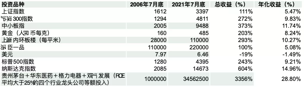 於是就選出了貴州茅台+華東醫藥+格力電器+雙匯發展,假設2006年7月31日將100萬元等分投入到這四家上市公司,到2021年7月31日賬户市值變成了3456萬元, 一不小心財富多了幾十倍。十五年間的年化回報就是28%左右。這再一次印證了,如果以實業思維長期投資,分享上市公司的經營收益,長期的回報率就約等於這些公司的平均淨資產收益率ROE。這樣的收益戰勝通脹是不在話下的。