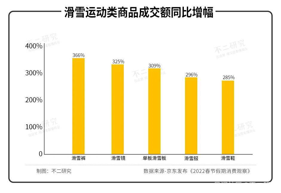 根據京東發佈的《2022春節假期消費觀察》,1月31日~2月5日滑雪/冰上運動類商品整體成交額同比增長322%。其中滑雪面罩成交額同比達15倍,滑雪褲、滑雪鏡、單板滑雪板、滑雪服、滑雪鞋等也都取得了較高增長。