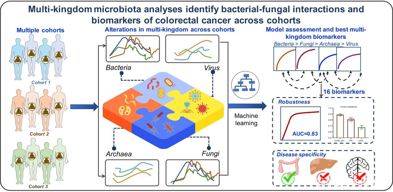 然而,除了細菌以外,真菌、古菌和病毒這些非細菌微生物羣同樣是腸道微生態的重要組成部分,這提醒了我們多界微生物在結直腸癌微生物羣失調中的重要作用,然而,這一方向還沒有得到有效探索。2022年1月27日,仁東醫學研究院執行院長、同濟大學生物信息系、同濟大學附屬第十人民醫院朱瑞新教授團隊和中山大學附屬第六醫院朱立新團隊進一步聯合上海交通大學醫學院公共衞生學院王慧教授、中科院上海營養與健康研究所張國慶教授和復旦大學陳興棟教授在 Nature Microbiology 期刊發表了題為:Multi-kingdom microbiota analyses identify bacterial–fungal interactions and biomarkers of colorectal cancer across cohorts (https://www.nature.com/articles/s41564-021-01030-7)的研究論文[2],開創性地實現了結直腸癌的多界微生物診斷。