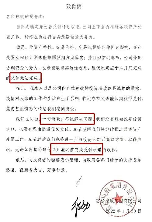 值得一提的是,在排名前進幅度不大的2020年和“一覺回到解放前”的2021年,也正是雪松控投理財產品開始暴雷的時間段,早在2020年,雪松被曝光42只信託產品風控預警,2021年4月至今,更是發生大規模理財產品逾期,而雪松信託只是多次給投資者發佈“產品兑付安排告知函”一拖再拖,指望息事寧人,沒想到進一步消磨了投資者的耐心與信任,哪怕帶有張勁親筆簽名的《致歉信》發佈,也阻擋不了聚集事件的發生。