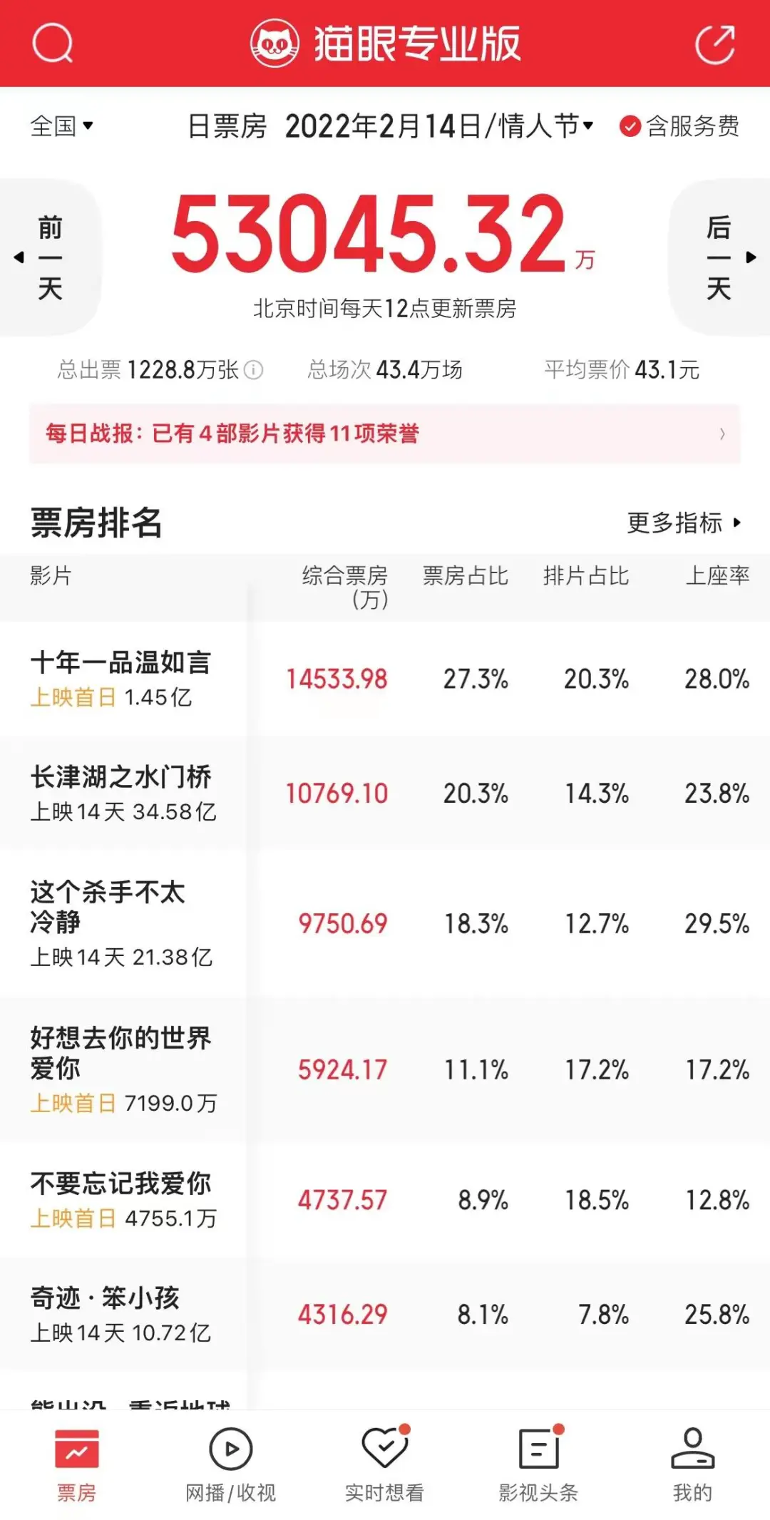 根據貓眼專業版,2月14日,全國總票房破5.3億元,《十年一品温如言》排片佔比達到20.3%,票房佔比27.3%,截至15時31分,票房即已破億,領跑情人節檔,力壓已經上映14天、拿下單日票房冠軍13天的《長津湖之水門橋》,成為新的單日票房冠軍。