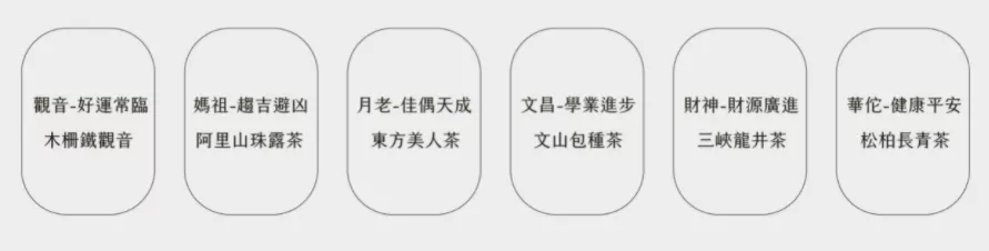 同樣,茶包內的茶葉也很有講究,以神明與祈求的願望為基礎,選擇不同種類的茶葉。比如向觀音祈求好運常在的茶包選用木柵鐵觀音茶(由台灣木柵地區產出),而向華佗祈求健康平安的松柏長青茶不僅在茶種名字上相呼應,本身也具有降低血液粘稠度、防止主動脈粥樣硬化的作用。在100位受試者的訪談回饋中,大部分人表示很喜歡這個創意的結合,期待商品的上市。