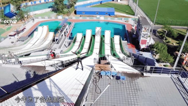 訓練場地的落地部分,是由一個露天的水池來代替雪場。從陡坡向下速滑後,她的身體會在空中騰起,最後躍入冰冷的水池之中。圖源:CCTV記錄