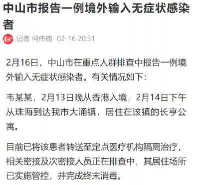 就在剛剛,中山也報告了一例從境外輸入感染者。同樣是從香港入境,同樣是經由珠海抵達當地。