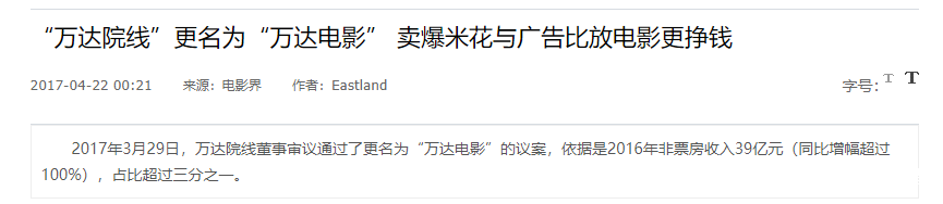別小看這“賣爆米花”的13.3億元營收!2016年,萬達院線放映電影的利潤率為21%,儘管已經在同行業中處於領先地位,但仍遠不及“賣爆米花”高達61%的利潤率。小小的爆米花,成為萬達院線最賺錢的產品。