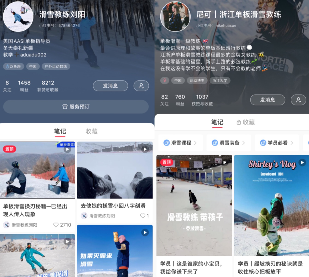 如今,打開小紅書、抖音和B站,搜索關鍵詞“滑雪”,會看到很多滑雪教練的賬號。“教練證+常駐雪場+xx明星教練”,成為他們的常用簡介三件套。