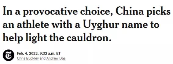 美國《紐約時報》帶頭陰陽:“中國讓一位有維吾爾族名字的運動員去點燃聖火”,還在內文繼續含糊其辭的稱迪妮格爾為“據中國人説擁有維吾爾族血統”的運動員。