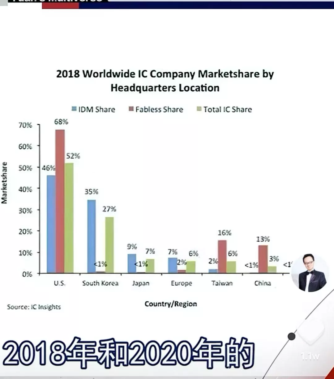給大家解釋一下,芯片一定有一個設計公司,製造出來公司再賣到市場上。可以是自己造,就是IDM模式,設計製造都包;也可以是讓其他企業代工,就是Fabless模式。這兩張圖中的國別歸屬是按設計公司所屬地區分的。IDM生產的比Fabless的要多一些,佔65%。
