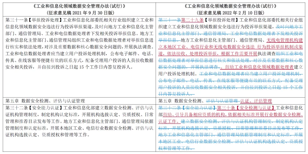 ● 放寬認證機構管理:此前《管理辦法》(0930版)第三十二條明確要求工業和信息化部和地方監管部門建立數據安全檢測、評估與認證機構管理制度,制定機構認定標準,開展機構選拔認定、資質授權、日常管理和推薦目錄發佈等工作。但《管理辦法》(0210版)中刪除了由監管部門開展機構選拔以及資質授權的要求,改為了“工業和信息化部鼓勵、引導具備相應資質的機構,依據相關標準開展行業數據安全檢測、認證工作”。