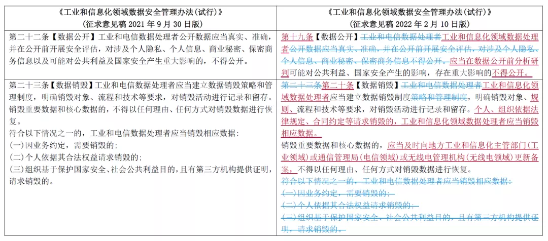 ● 數據銷燬:新增“銷燬重要數據和核心數據的,應當及時向地方工業和信息化主管部門(工業領域)或通信管理局(電信領域)或無線電管理機構(無線電領域)更新備案”。