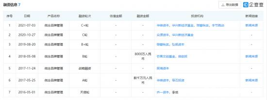 另一方面,**與李佳佳合作後,隨着李子柒這個IP越做越大,微念這個公司也被越來越多的人注意到。**據天眼查融資歷程顯示,微念至今已完成5輪融資,2018年以來的融資中,投資方包括新浪微博、芒果文創基金等。在最近2021年7月份的融資中,還可以看到字節跳動的影子,自此杭州微唸的市場估值一度高達50億元。據開菠蘿財經報道,微念50億的估值是從一家新消費公司的角度給的,機構根據品牌的銷售額,按照這兩年消費賽道常規PS值3-10倍給到估值。
