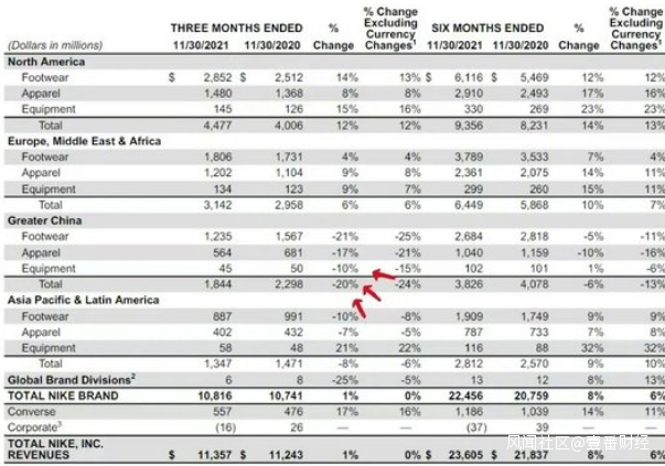耐克在中國的業績還受到了生產端的影響。2022財年二季度(截至2021年11月30日的三個月)財報顯示,由於疫情造成越南工廠關閉,大中華區營收同比下降了20%。