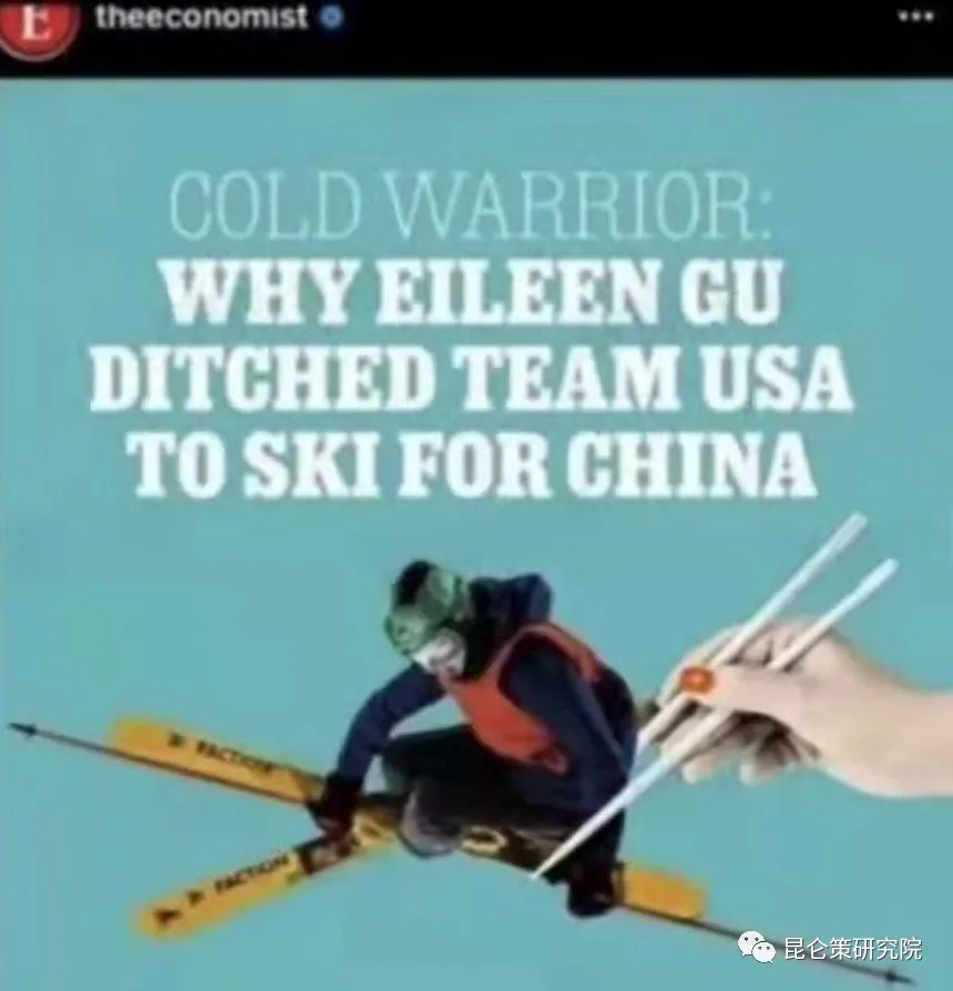 【上圖為英國《經濟學人》發文原始配圖,用筷子諷刺谷愛凌被中國“鉗制”。下圖為被谷愛凌霸氣回懟後,《經濟學人》修改的配圖,去掉筷子,將滑板換成中美兩種顏色。】