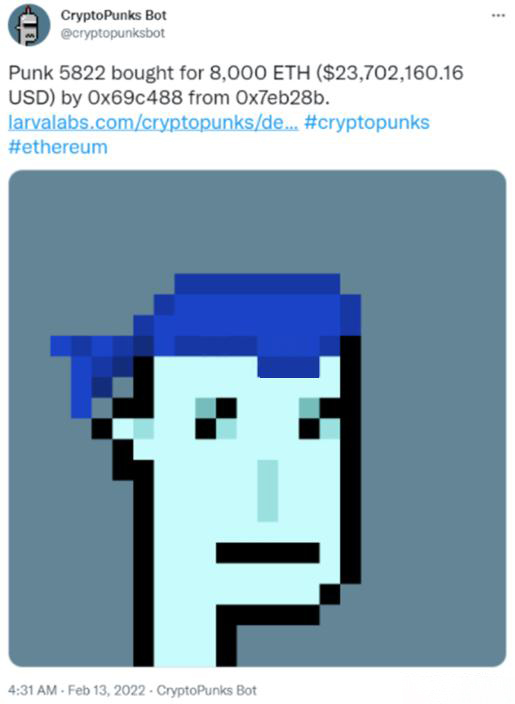2022年2月13日,CryptoPunks發行了三年多的萬副作品之一、編號#5822 以8000ETH(以太幣)的價格售出,約2370萬美元。次日,區塊鏈技術公司Chain 首席執行官 Deepak Thapliyal 在社交媒體上宣佈自己為 CryptoPunk #5822的買家。