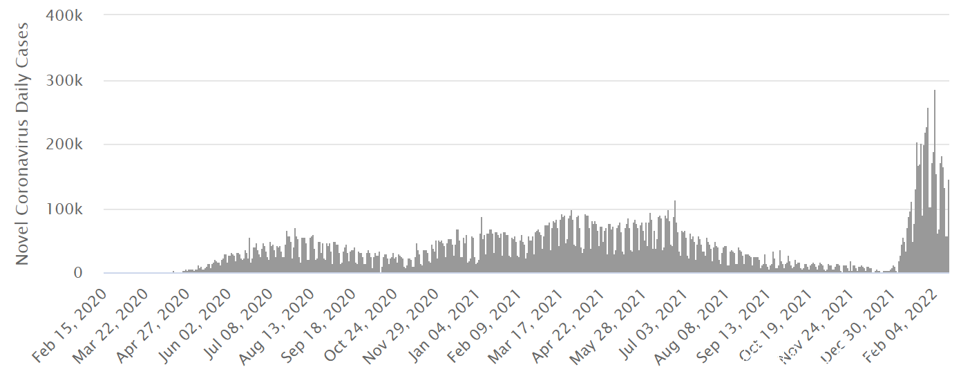 全球單日新增確診病例(2020.01.22-2022.02.16)