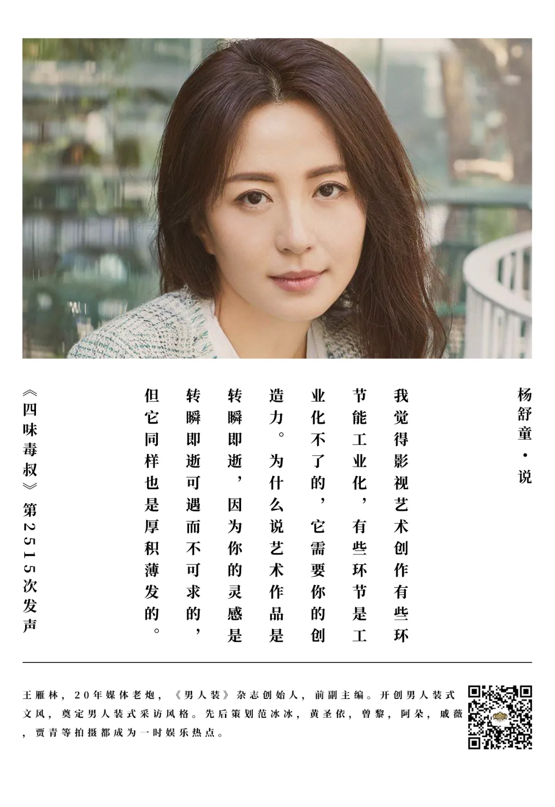 **楊童舒:**我也演夠了媽媽。這段時間除了我特別感興趣的角色,其他的我不演。因為確實一樣的角色演多了之後就變成複印了,我覺得影視藝術創作有些環節能工業化,有些環節是工業化不了的,它需要你的創造力。為什麼説藝術作品是轉瞬即逝,你的靈感是轉瞬即逝可遇而不可求的,但它也是厚積薄發的。當你積累了很多,你勃發了這一點之後,你再發就掏空了。