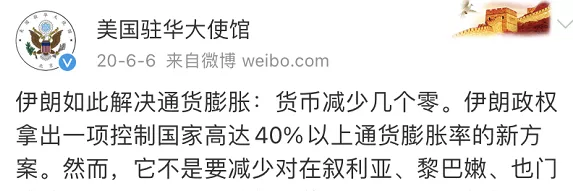 起因是美國駐華使館發博稱,伊朗解決通貨膨脹,是將貨幣減少幾個零!