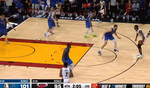 熱火對於東契奇採取的是塔克盯防,遇掩護就夾擊的防守策略,如果東契奇不要掩護一對一,熱火會堵住他在中路的突破路線,同時兩翼會收到罰球線的兩側,築起一道牆,不讓他突破到禁區。