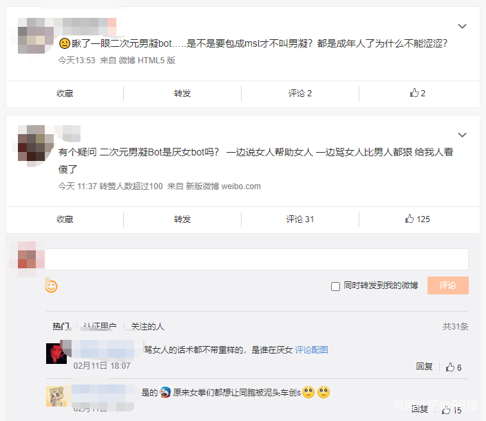 評論區也有人開始思考,二次元男凝BOT裏每一條投稿的目的,除了聚眾吐槽和避雷以外,是否還能向更深層的地方發展?