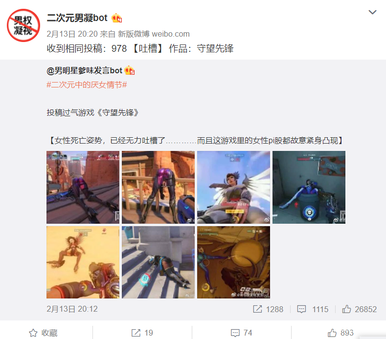 但前文我也特別提到過,這個BOT的“男凝”指的是“男權凝視”,而投稿中強調的“吐槽”二字也明確,這裏描述的都是男權社會下對女性自上至下的特殊凝視。